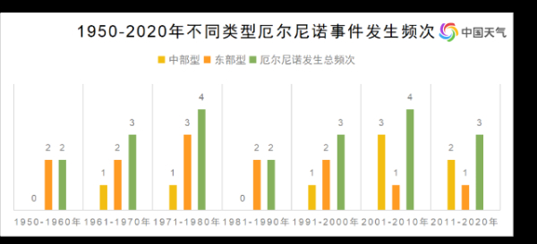 1950-2020年不同类型厄尔尼诺事件发生频次