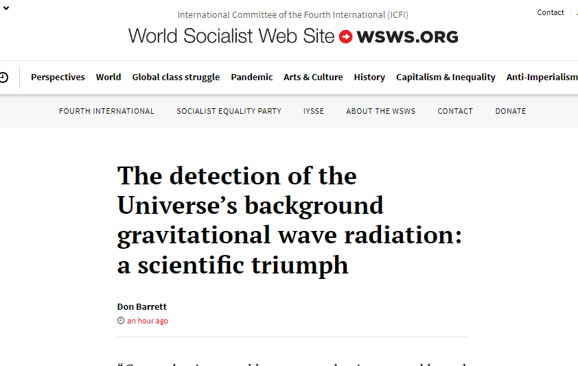 《经济学人》文章中称,该引力波的来源还有另一种可能,虽然可能性要小得多,但也十分令人兴奋,即最新探测到的引力波可能是人类对宇宙早期历史的最深刻一瞥,当时宇宙的体积在短时间内迅速增加,并造成这种“嗡嗡声”。