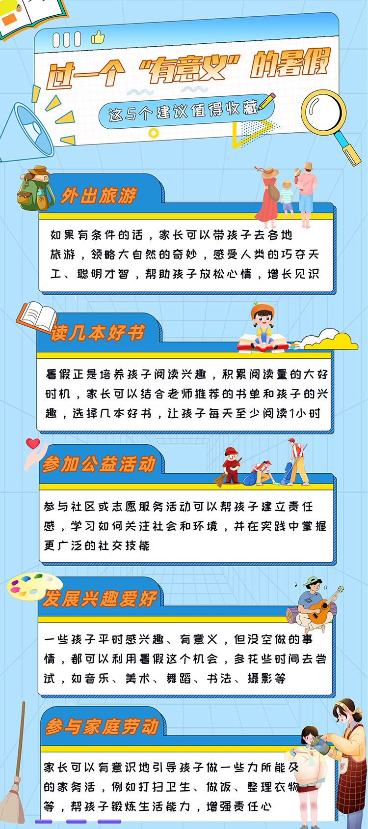 希望每个孩子都能在家长的陪伴下度过一个充实、有趣、意义非凡的暑假!(编辑/海报设计:冯文雅终审:陈竞超综合新华社、人民日报等媒体报道内容)