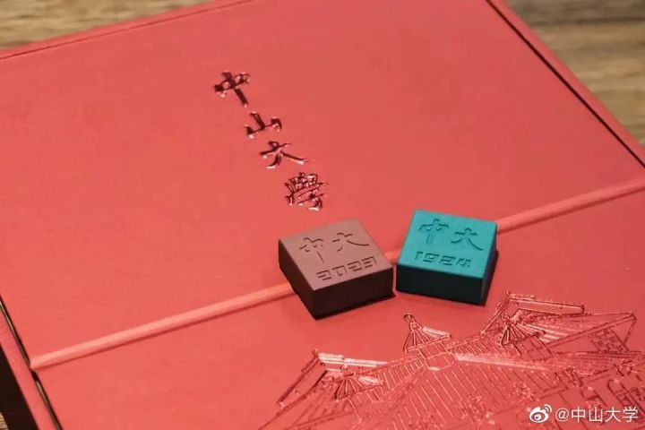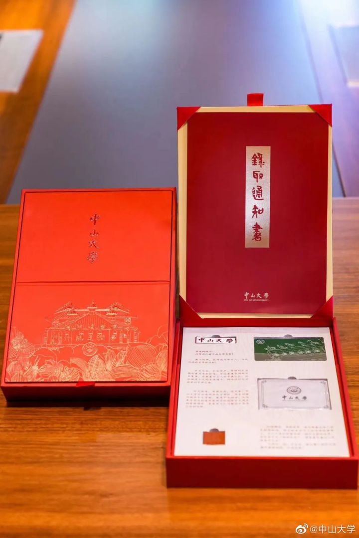 中山大学的,体现了中大康乐园“红砖绿瓦”的特色:有红砖样式的录取通知书套,刻字“中大”瓦当的绿色羊城通……