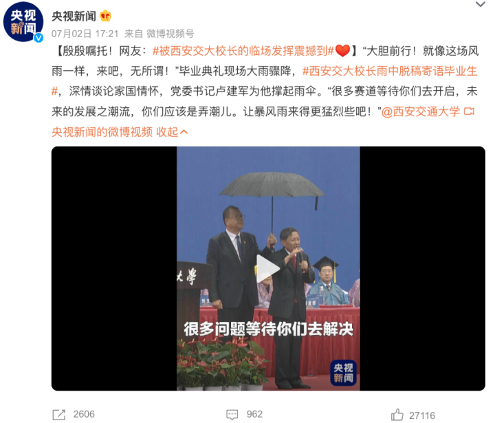 毕业典礼上,书记给校长撑伞5分钟的发言视频,又上了热搜,妥妥的双杀啊。