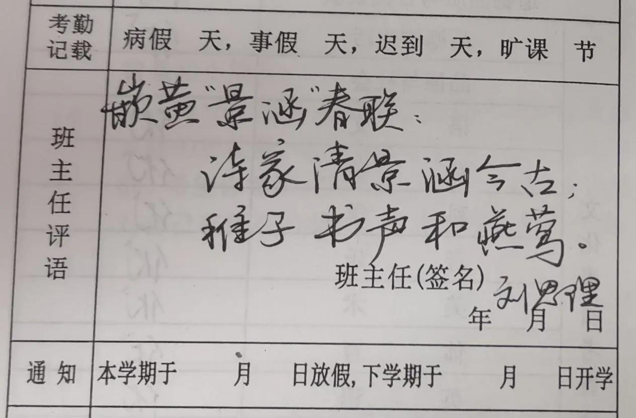 图为刘思理为黄景涵同学所写的嵌名春联评语