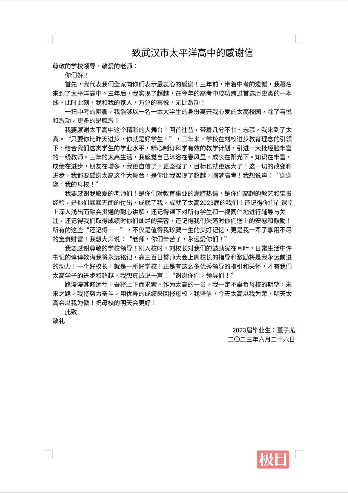 “三年前,带着中考的遗憾,我慕名来到太平洋高中。三年后,我实现了超越,在今年高考中成功跨过首选历史类的本科特殊招生线……”这是一封来自武汉太平洋高级中学高三一班董子尤的感谢信,今年高考董子尤以历史类527分的成绩,从中考普高线下生逆袭,到如今,冲上本科特殊招生线,他在信中表达了对太平洋高中老师们的感激。