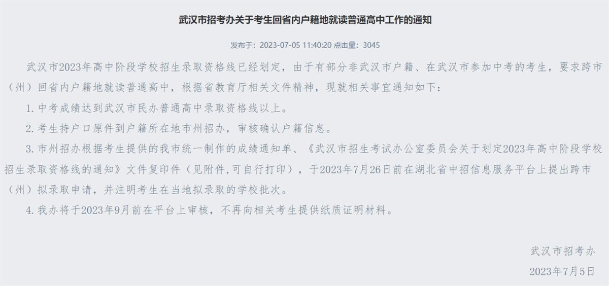极目新闻记者7月6日从武汉市招考办获悉,武汉市2023年高中阶段学校招生录取资格线已经划定,由于有部分非武汉市户籍、在武汉市参加中考的考生,要求跨市(州)回湖北省内户籍地就读普通高中,根据湖北省教育厅相关文件精神,现就相关事宜通知如下: