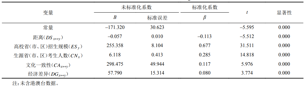为了探究中国高校学生流动的影响因素,本文利用高校招生计划数据,通过纳入分析人口流动的引力型基础因素(距离,源节点与汇节点的规模),并加入影响学生流动的特殊影响因素(即,文化一致性和经济水平差异),从距离、高校所在省(市、区)招生规模、生源省(市、区)考生人数、文化一致性和经济水平差异性等五方面选取指标,使用多元回归模型,探究高校招生过程中学生就学迁移网络的主要影响因素。