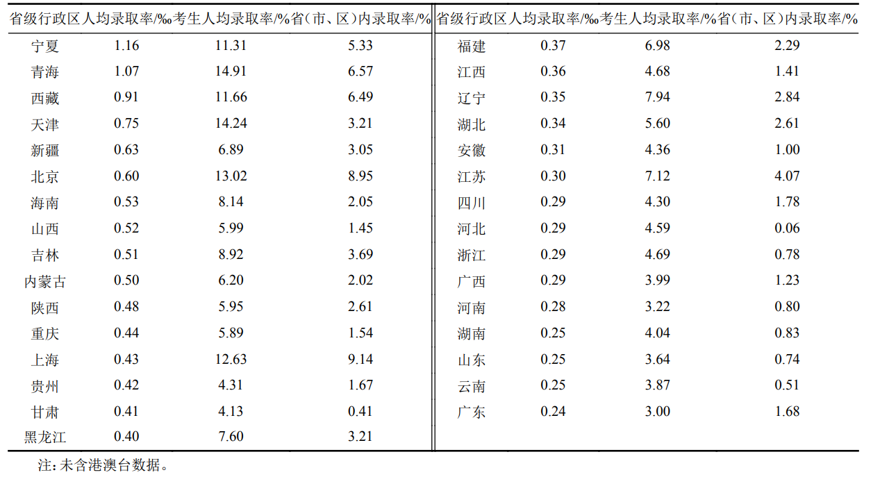 表1各省级行政区人均录取率、考生人均录取率和省内高校录取率