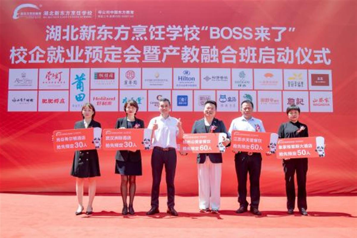 近日,湖北新东方烹饪学校举行“Boss来了”校企就业预定会暨产教融合班启动仪式。7月10日,极目新闻记者从学校了解到,北京、上海、深圳、浙江、江苏等地的20家知名餐饮企业,先后与学校签订1430人的用人订单,学生入校即赢得未来就业的机会。