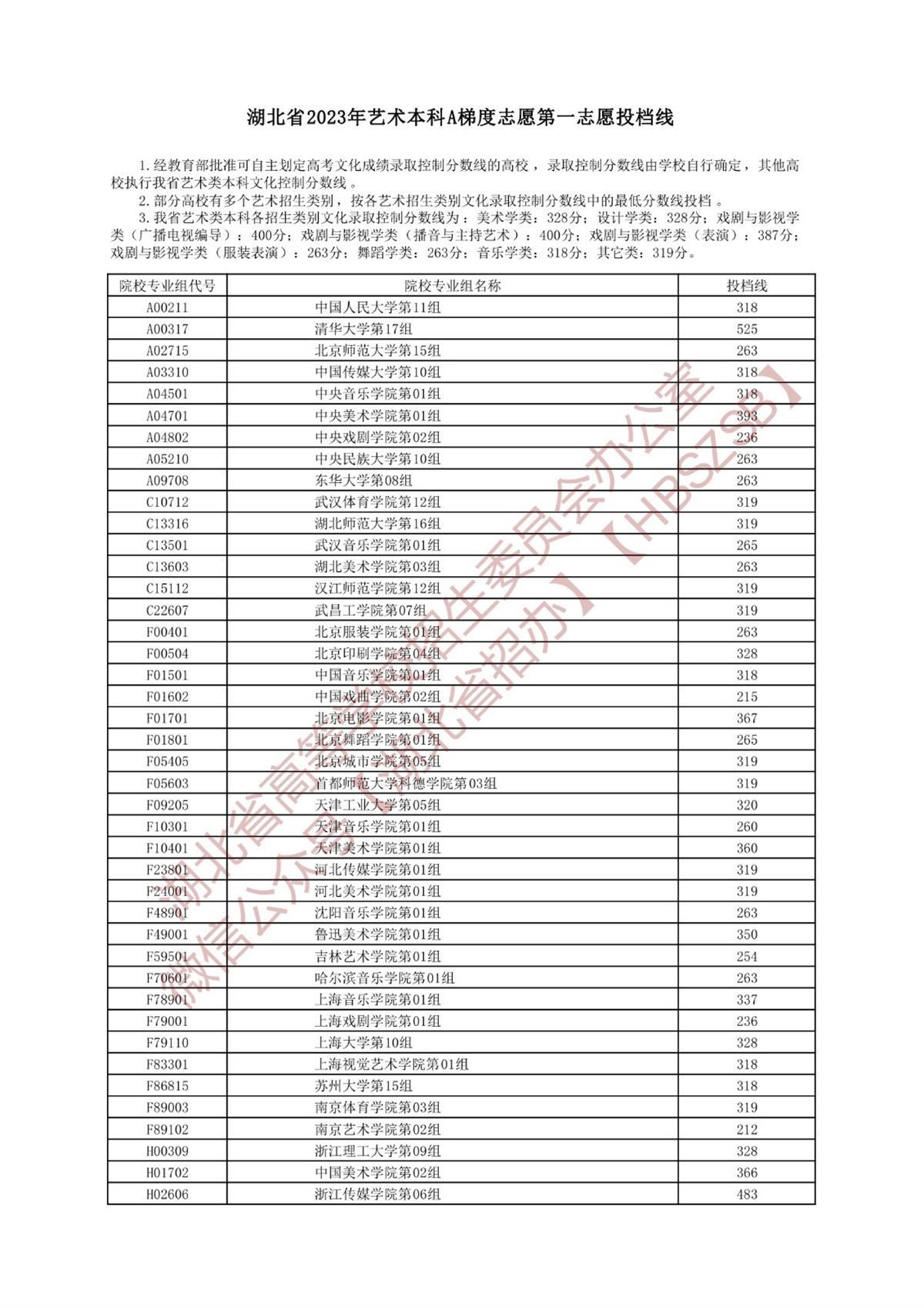 7月10日,湖北省招办公布了2023年艺术本科A梯度志愿第一志愿投档线。