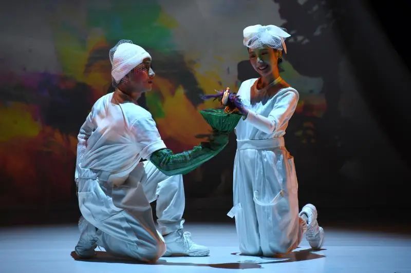 绘本是平面的文字和图案,编导运用戏剧的手段,让它“站”了起来。选段中,白色的舞台上,小鸟和莲蓬的对话,演员们用舞蹈的形式,通过肢体来表达。舞台上的布局和道具都来自于生活,通过艺术加工,被用来营造各种氛围。