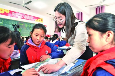 重庆云阳县红狮镇彭咏梧小学,一位青年教师在辅导孩子感受语文之美。彭炼摄/光明图片