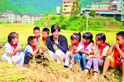 湖南怀化通道侗族自治县独坡镇九年一贯制学校,新入职的教师把课堂搬到田间地头。李尚引摄/光明图片