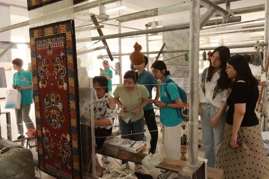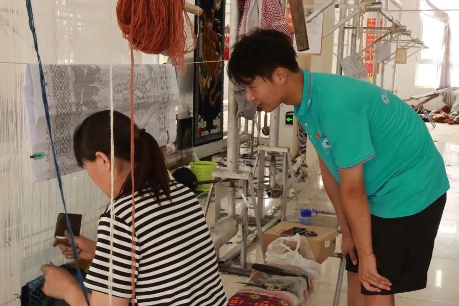 在鄄城永铭地毯有限公司内,车间内十几位女工坐在挂满纺织毛线的机器前,动作娴熟地制作图案各异的羊毛地毯。