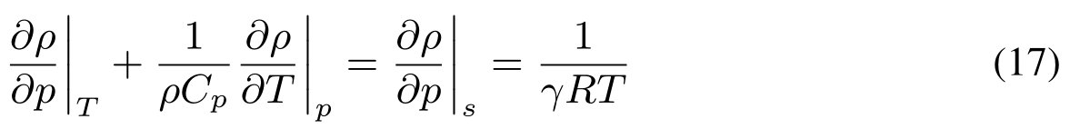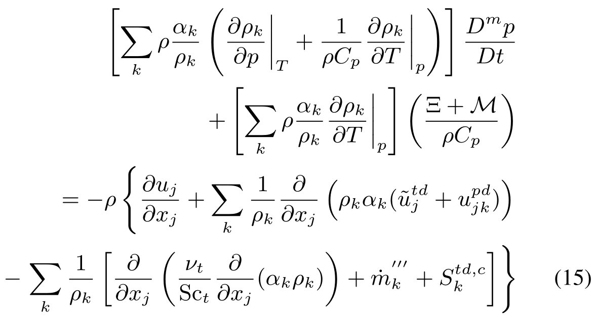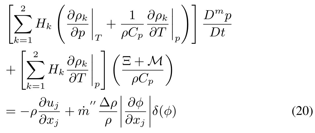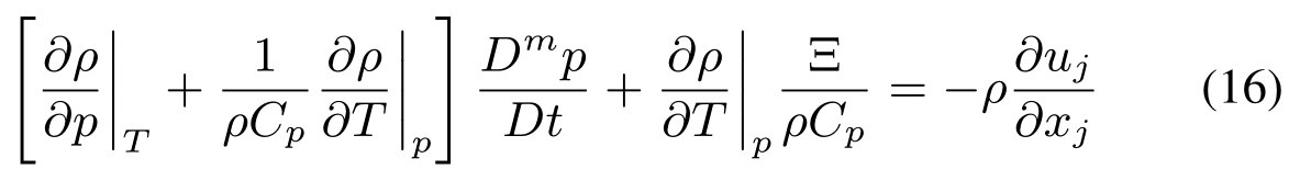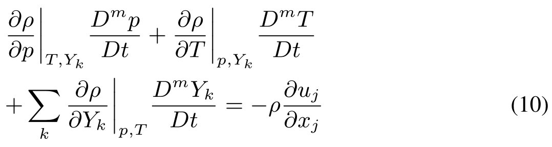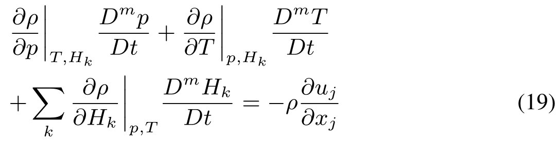 取ρ=ρ(p,T,Yk)我们可以将上述方程展开为基于独立未知量的线性化,如下:
