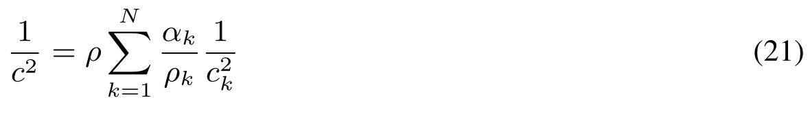 方程(20)中的最后一项为由于相变导致的源项。需要注意的是,流体体积模量的体积加权求和并不能得到由系综平均方程得到的Wallis声速。