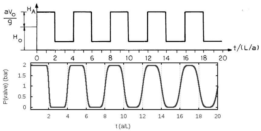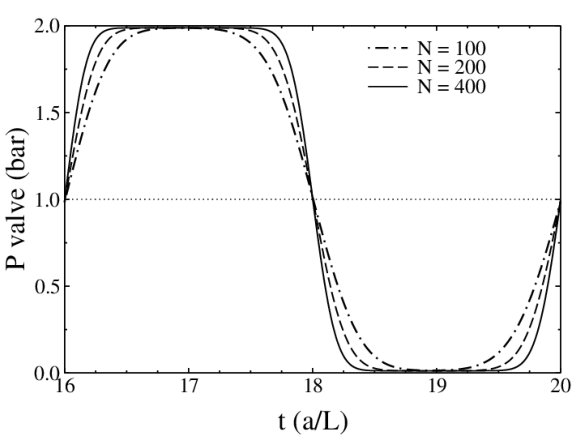区域封闭端(阀)处的压力演化如图2所示,并与解析解进行了对比。在这种情况下,计算域被离散为100个控制体。压力峰值预测准确,但随着时间的推移,由于数值扩散,波形变得模糊。精细化网格(200和400单元)的结果如图3所示,表明它们逐步收敛。