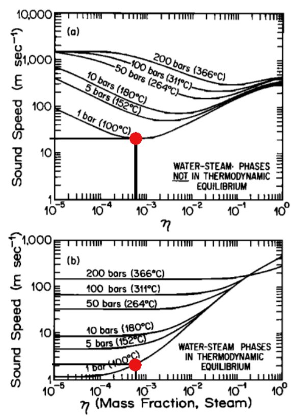 饱和系统的声速如图7所示。可以看出,对于1bar的系统,声速可以低至1m/s。这里模拟的情况用红点表示。