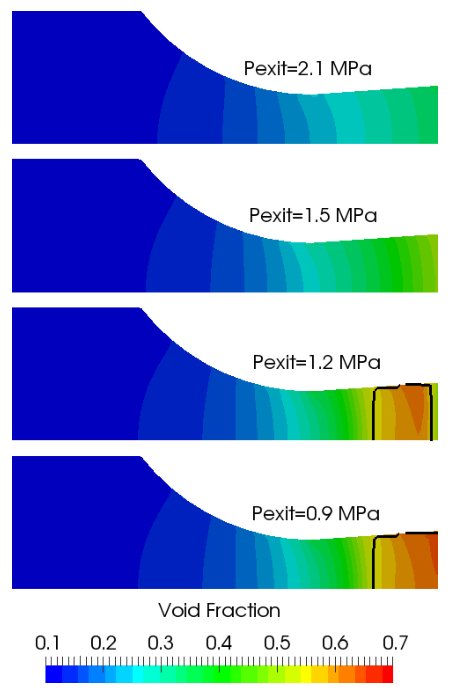图10显示了喷嘴内蒸汽体积分数的变化情况。Flashing导致体积分数从入口的0.1增加到喷嘴阻塞前的0.7左右。在多相流情况下,声速非线性特性极强的,所谓的声线(黑色轮廓线)并不一定出现在喉部,如图10中较低的两个压强所示。
