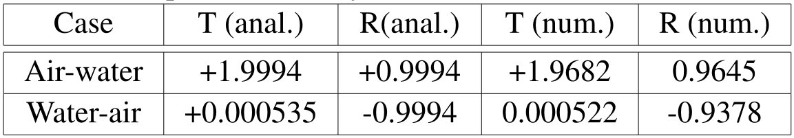 解析透射和反射系数如表2所示,并给出了相应的数值结果。这个问题很有趣,因为在空气-水的情况下,反射波的振幅与入射波的振幅相同,而透射波的振幅被放大了2倍。在波来自高阻抗流体(水-空气)的情况下,反射波改变了相位,几乎没有传输任何东西。可见,可压缩界面流动模型能够较准确地再现这种效应。不同波的压力信号如图6所示。