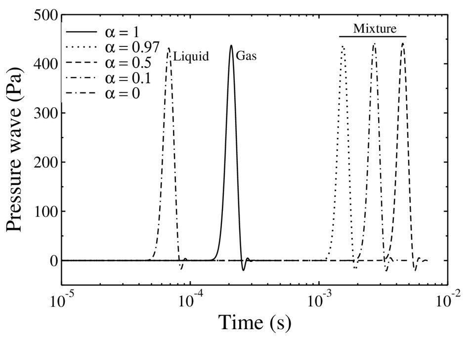 在所有情况下,远端的压力信号如图4所示。到达速度最快的是纯水,其次是纯空气,根据方程(21)的预测,之后依次到达的是体积分数分别为0.97、0.1和0.5的工况。将数值结果计算的声速与表1中的解析值进行比较。结果与分析值吻合良好(在3%以内)。