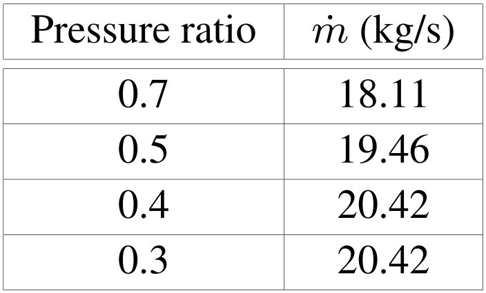 确认临界流量的唯一方法是观察质量流量,并验证它们不会随着出口压力的降低而进一步变化。由表3所示的质量流量可以看出,在压力比为0.3时,流量是临界的。横截面积的宽度为1cm。