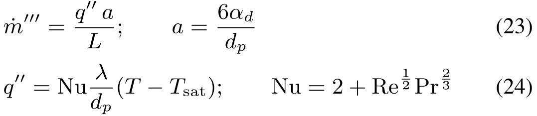 上一节提出的问题被扩展到包括1bar时蒸汽和水之间的传质。温度初始化为饱和温度372.756K。潜热规定为2.2MJ。选择蒸汽初始体积分数=0.5的情况。采用基于Ranz-Marshall相关的分散相传质模型。传质速率(kg/(m^3))为: