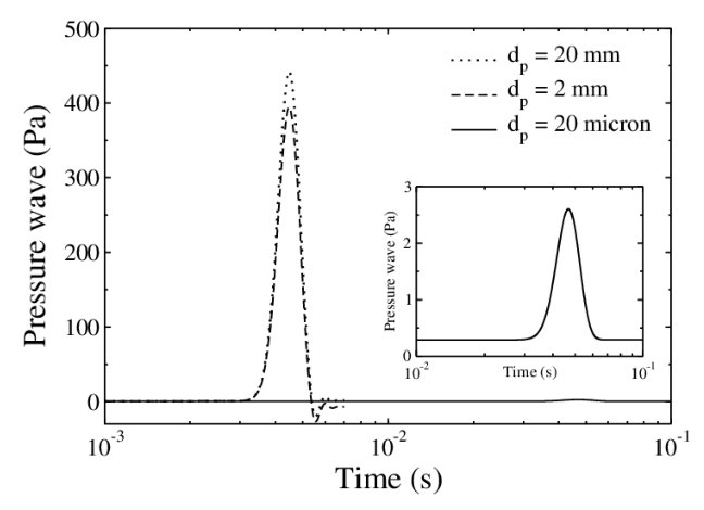 三种情况下远端压力信号如图8所示。对于较大的气泡/液滴直径,声速几乎不受影响(≈21m/s),接近图7所示的数据。当dp=20微米时,压力信号衰减明显,到达远端需要更长的时间。声速估计为1.96m/s,这与图7中水-蒸汽热力学平衡的数据非常接近。