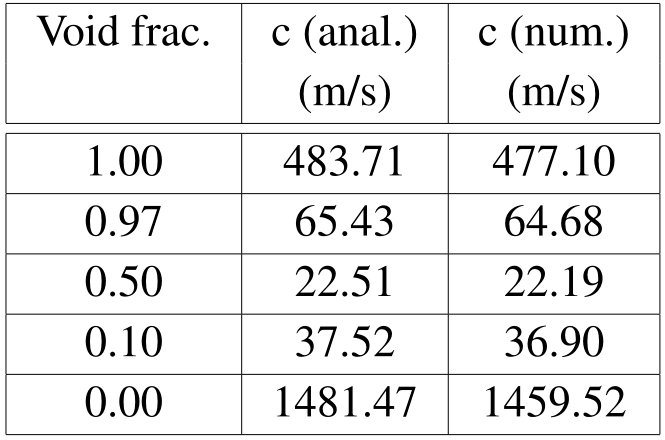 为了验证该模型对不同气液混合物的声速预测是否正确,我们初始化了一个长度为0.1m的一维计算域,其中气体的体积分数分别为1、0.97、0.5、0.1、0,范围从纯气体到纯液体。在计算域的一端设置一个振幅为1000Pa的初始压力脉冲,测量信号到达另一端的时间。使用64个控制体对计算域进行离散化。气相被认为是蒸汽,并被建模为理想气体,其分子量为18g/mol,热容比为1.2675。用ModifiedTait状态方程对液体进行建模。系统压力设置为1bar,温度初始化为400k。
