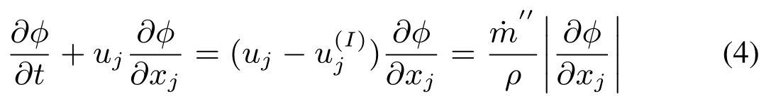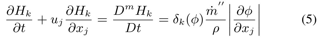 其中φ为到界面的距离,u为界面的速度。平滑Heaviside函数Hk依赖于距离函数Hk=Hk(φ)。Hk的物质导数为: