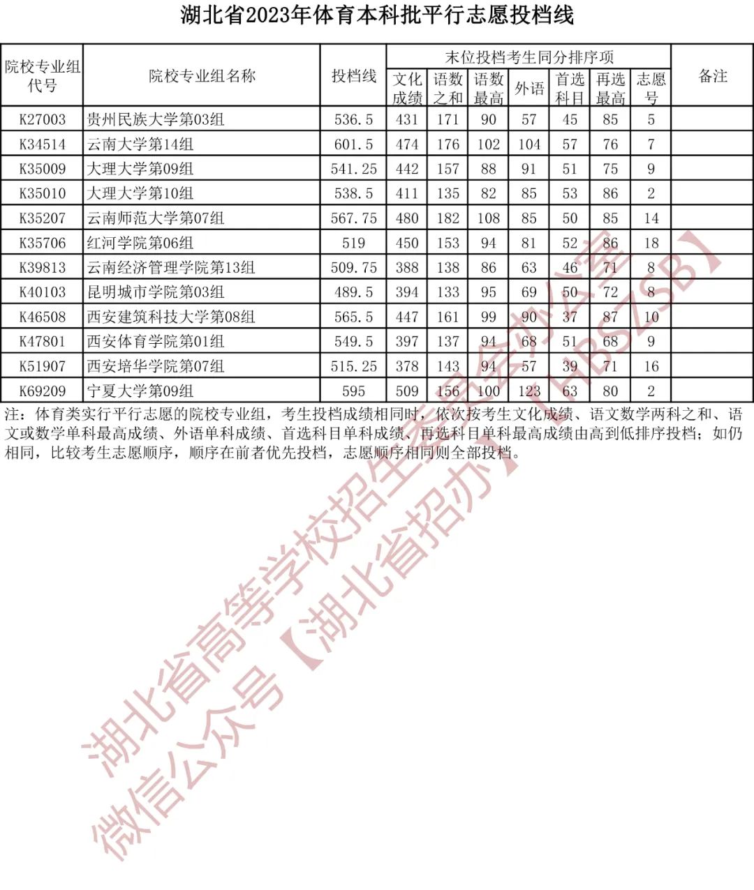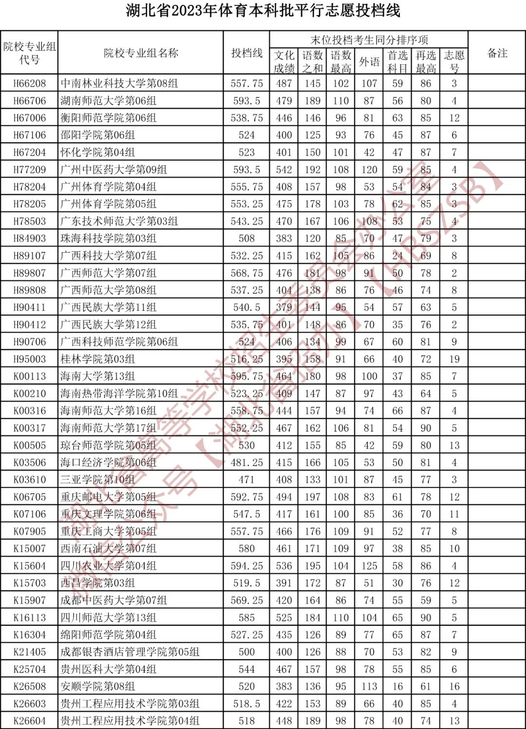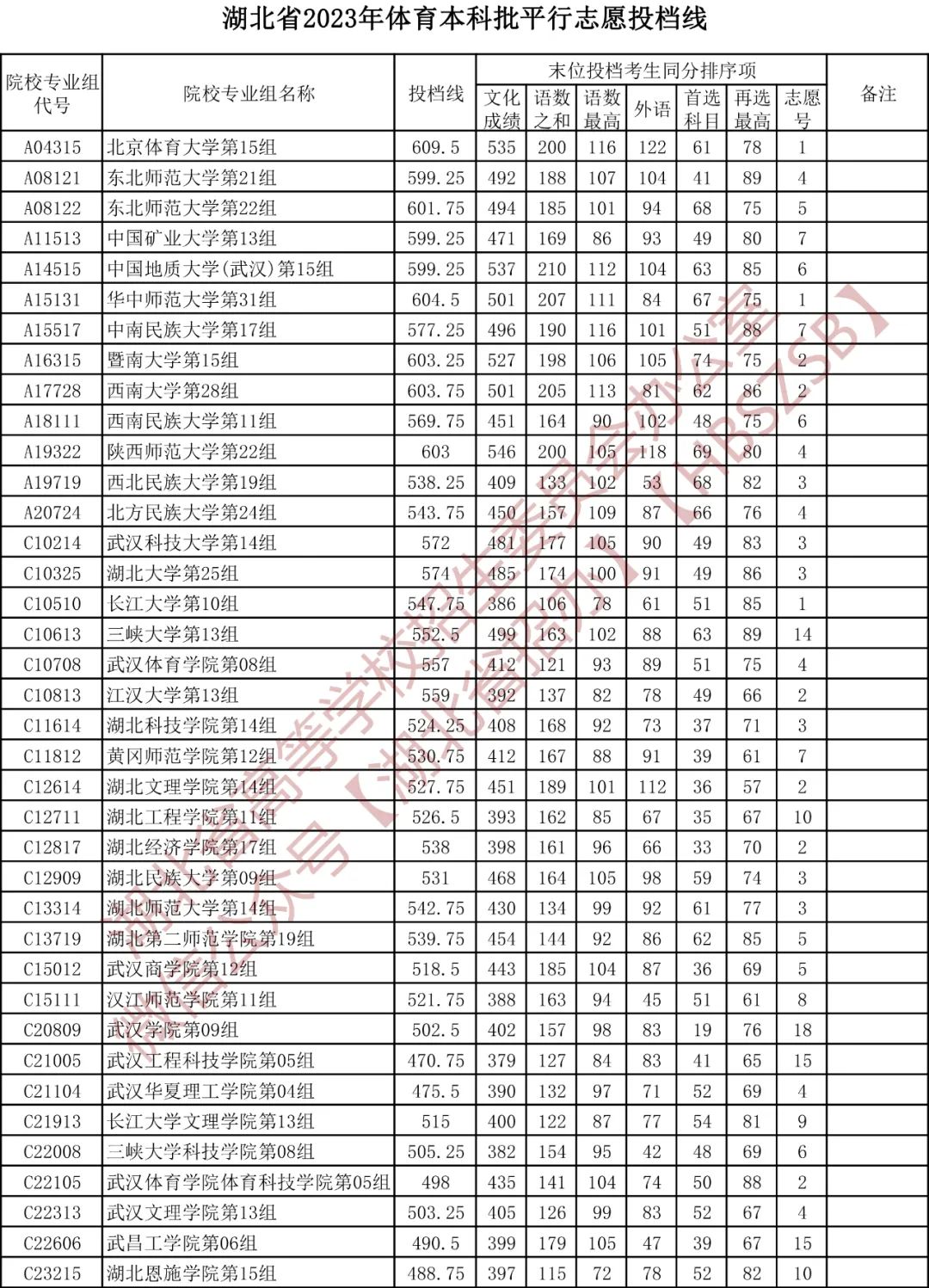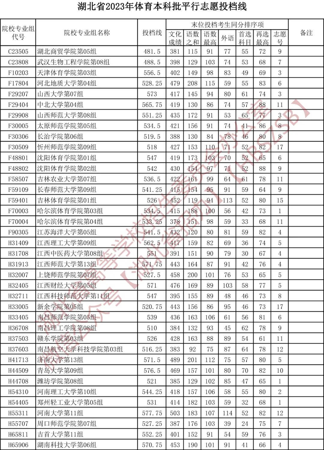 湖北省2023年体育本科批平行志愿投档线