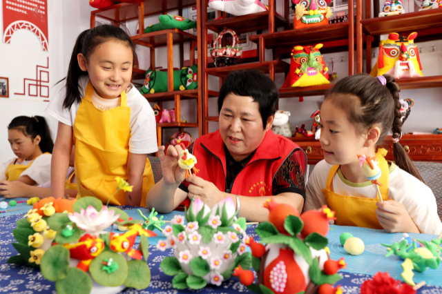 山东省枣庄市龙山路街道民间艺术志愿者王欣(右二)在工作室向学生们免费传授面塑制作技艺。中国教育报-中国教育新闻网通讯员吉喆摄