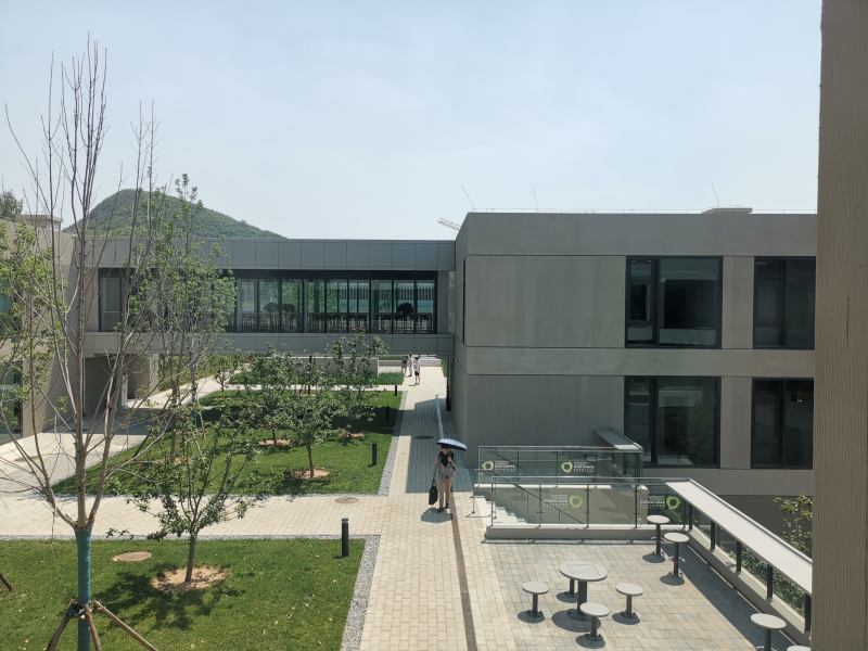 数学院永久地址选址北京金隅集团下属企业原北京兴发水泥厂,可远眺河防口长城蜿蜒起伏,近观红砖灰墙交相辉映。水暖管道改造成景观连桥、储存水泥的十八仓改造成研究生公寓楼、锅炉房改造成零碳展厅、水泥袋装库改造成科学档案馆……在被群山包围的绿色园区中,经过保护性拆除及改造的建筑随处可见,既有工业风,又有现代范儿。