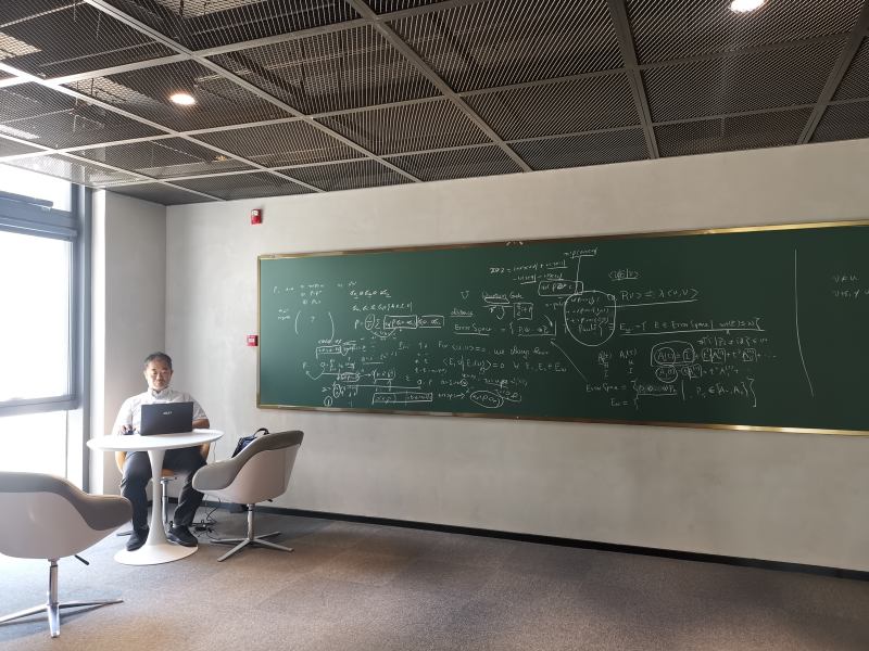 记者在A3教学楼组团看到,这一建筑组团包括多栋楼,中间通过连廊等连接,形成了高低错落的景观空间和下沉庭院。这里不仅有乒乓球台、棋桌,还有很多可供科学家交流的座椅。无论室内室外,墙壁上都有多块黑板,以便科学家记录下突发的灵感,一些黑板上还写着复杂难懂的数学公式。