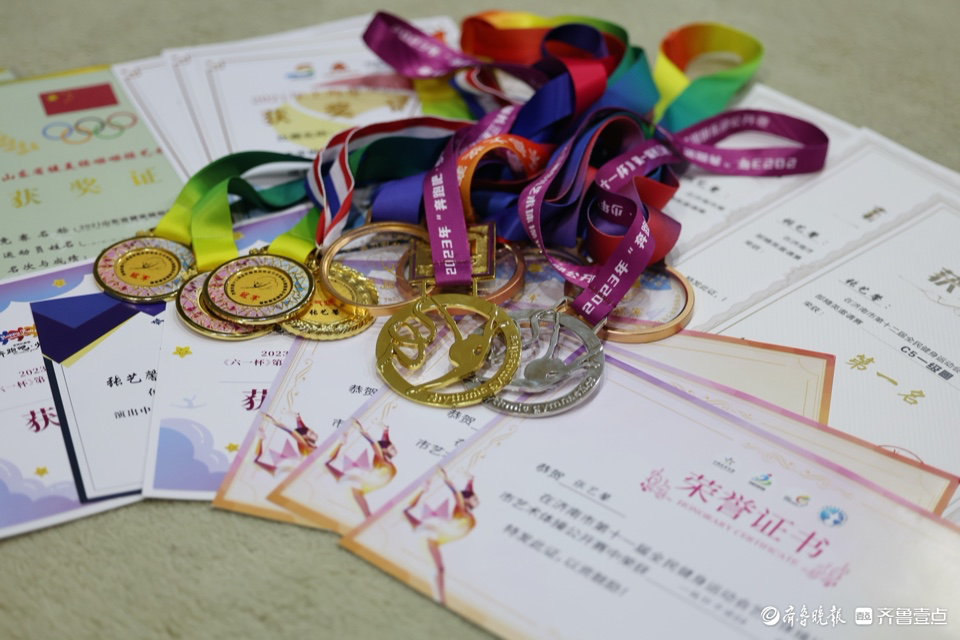 在妈妈的精心培养下,小艺馨的进步很快。6年来,她获得了无数荣誉,家里的证书、奖牌和奖杯数也数不清。今年2月份,她参加了在重庆举办的全国艺术体操青少年锦标赛,获得了国家一级运动员的称号。得知消息后,小艺馨抱着周婷婷说:“妈妈,我通过了,没有给您丢脸”。周婷婷瞬间红了眼眶。她知道,这个奖项对于12岁的小艺馨来说,是多么来之不易。她看在眼里疼在心上,但是小艺馨每次都擦干眼泪对她说:“妈妈,咱们继续练!”