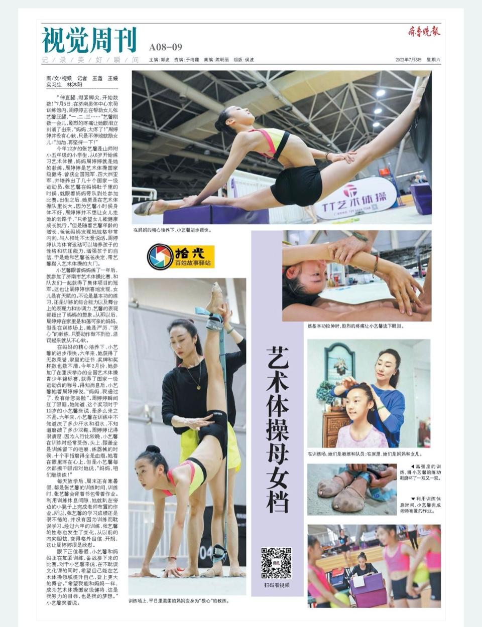 今年12岁的张艺馨是山师附小五年级的小学生,从6岁开始练习艺术体操,妈妈周婷婷就是她的教练。周婷婷是艺术体操国家级健将,曾获全国冠军、四大洲亚军,并培养出了几十个国家一级运动员。张艺馨在妈妈肚子里的时候,就跟着妈妈带队到处参加比赛。出生之后,她更是在艺术体操队里长大。因为艺馨小时候身体不好,周婷婷并不想让女儿走她的老路子,“只希望女儿能健康成长就行。”但是随着艺馨年龄的增长,爸爸妈妈发现她性格非常内向,与人相处不太爱说话。周婷婷认为体育运动可以培养孩子的性格和抗压能力,增强孩子的自信,于是她和艺馨爸爸决定,带艺馨踏入艺术体操的大门。
