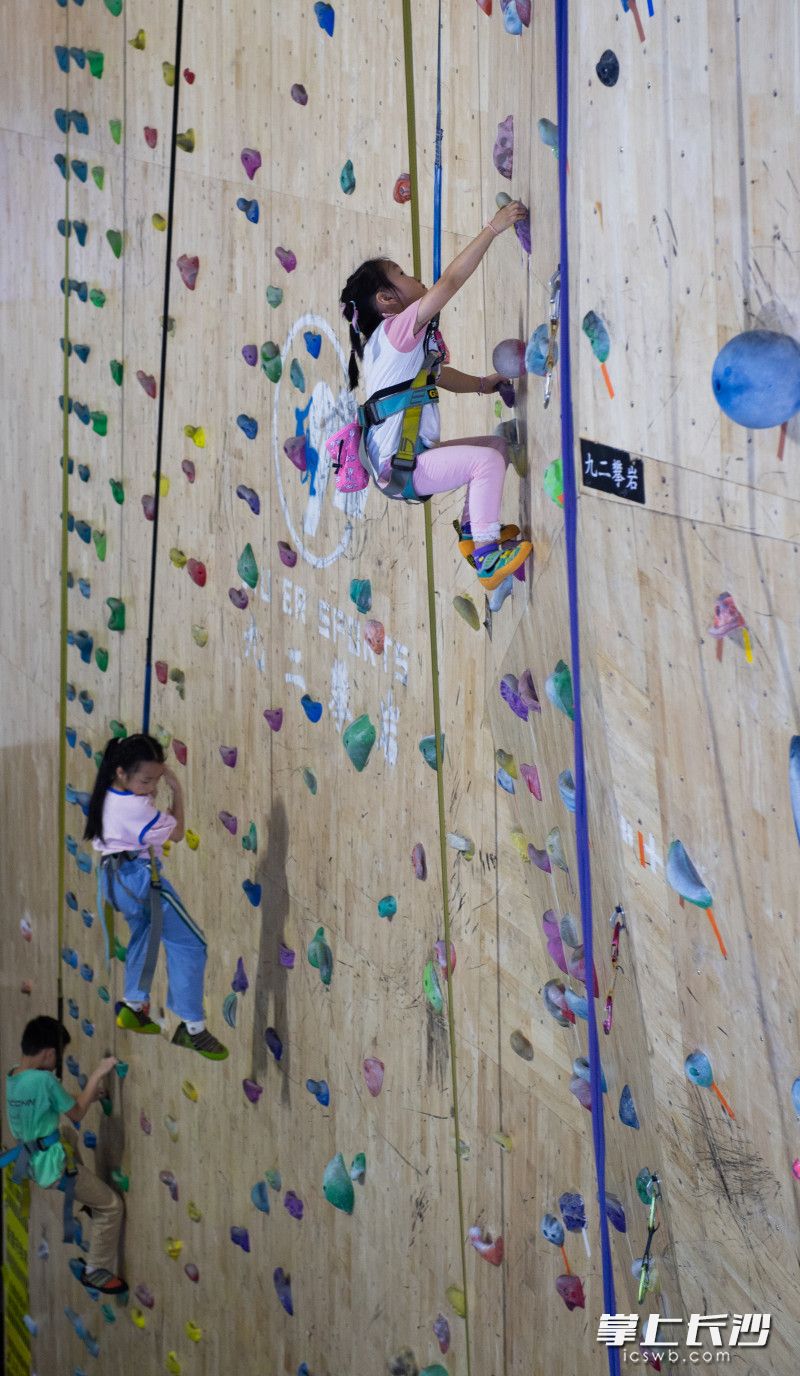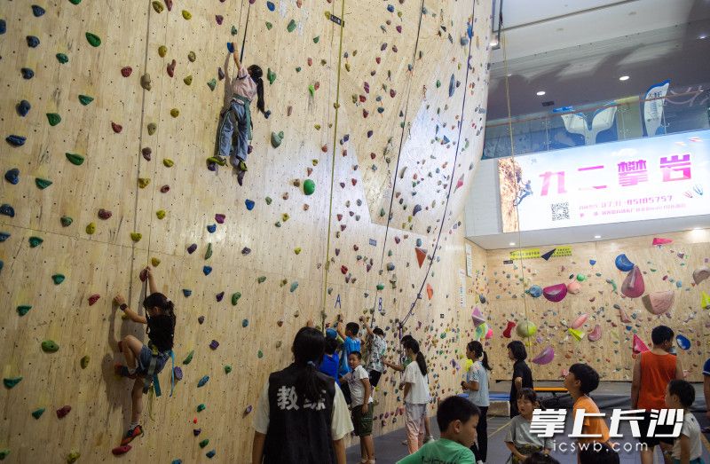 在九二攀岩贺龙馆,学生们正在参加暑假免费培训。