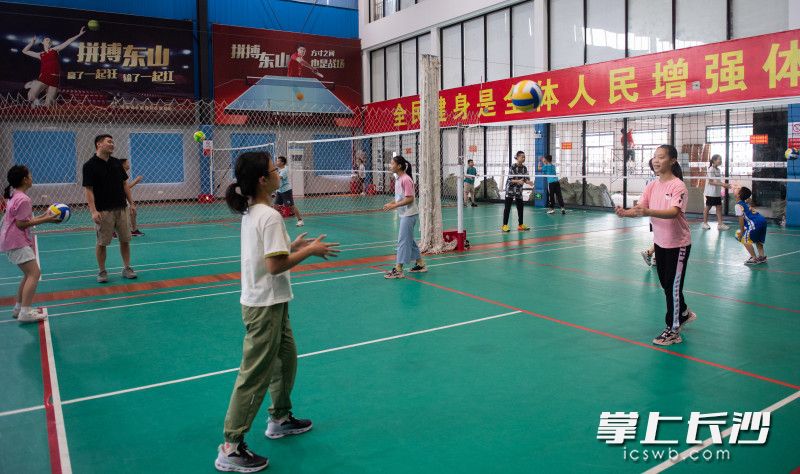 在东山全民健身中心,学生们正在进行暑假免费排球培训。