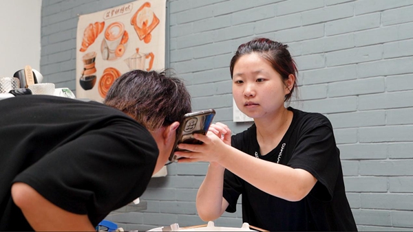跟小陈一样,沈师傅也是残疾人融合就业街区的一位理发师,他做理发师10多年了,最擅长快剪男头。因为家庭条件不好,从小没有钱去训练读、听能力,所以在工作中,他只能用文字、简单手势来跟客人沟通发型要求。他的顾客中老年人偏多,文字交流更加费劲。试用产品后,他能非常顺畅、快速地了解客户需求,平时生活中上医院、上超市、上高铁都方便多了。