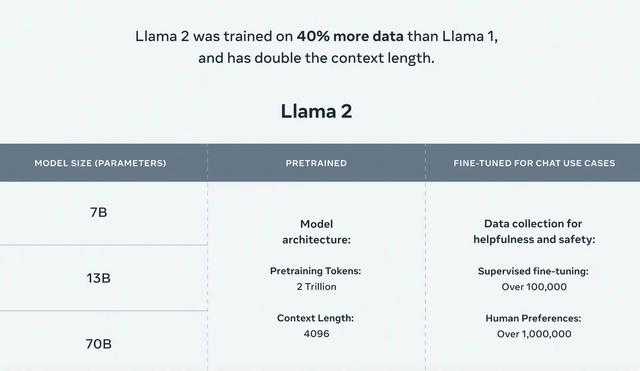 根据Meta的官方数据,Llama2预训练模型接受了2万亿个tokens的训练,相比于上一代训练数据提升了40%,并纳入超过100万条人工注释,以提高其输出的质量。目前Llama2包含70亿、130亿和700亿参数三个版本,此外,还训练了340亿参数变体,但这一参数只在技术报告中提及,并未发布。
