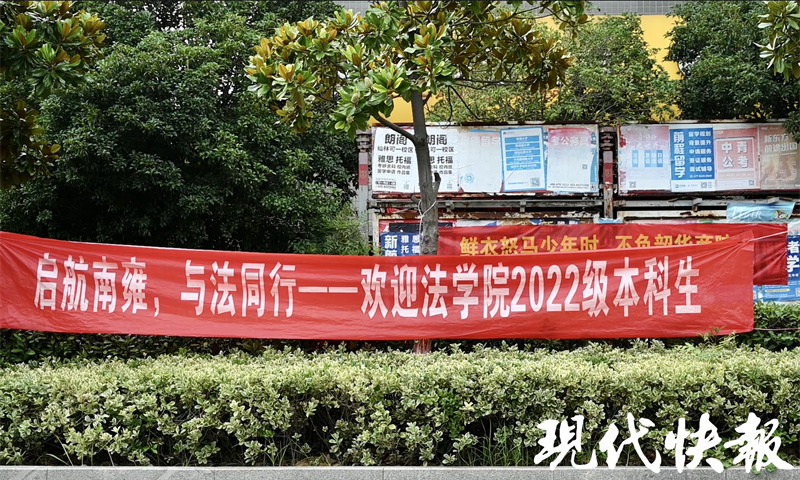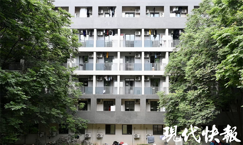南大南园宿舍楼旁,记者看到,路边停着不少搬运货物的车辆,紫色的挡雨亭下放置着同学们的行李,陆续有同学从宿舍带着行李走到北园登车。路边还摆放着消暑的饮用水。