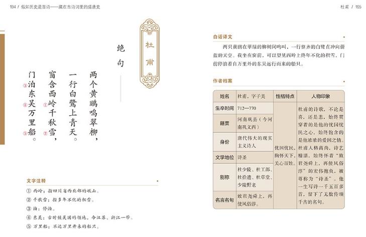 这本书以中小学生必背101首诗词为主线,将盛唐主要历史串联起来,并解读一首首古诗词背后的故事的人物生平、趣味故事和历史脉络,尽可能给读者还原一个个真实的诗人。