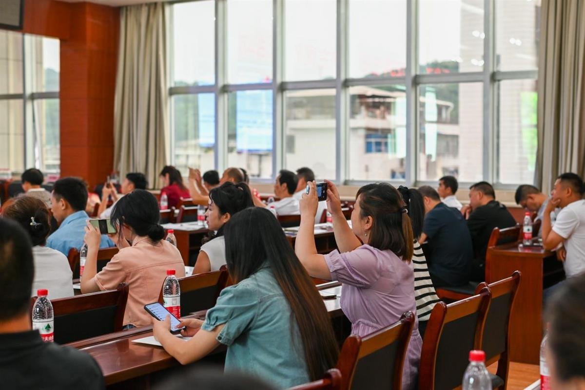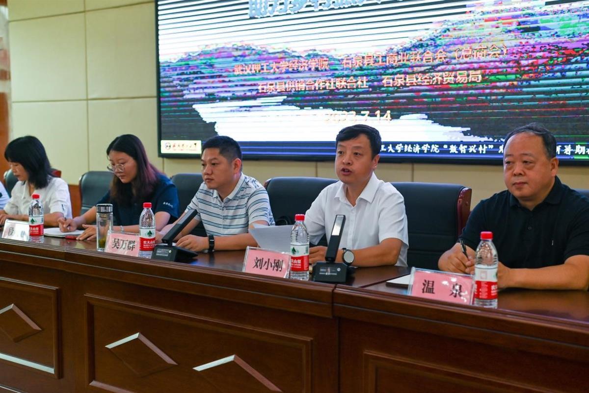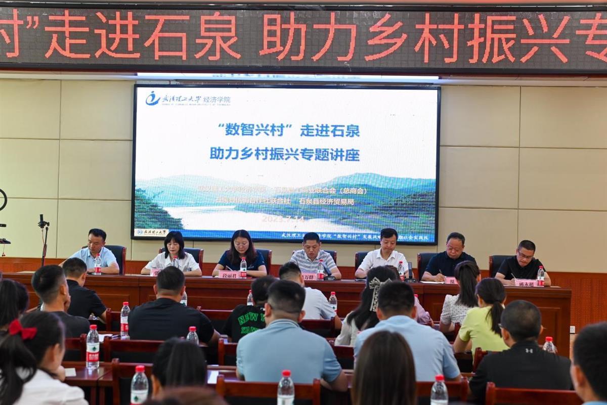 实践队于7月14日在陕西省安康市石泉城区商会会议厅举办“数智兴村”走进石泉助力乡村振兴专题讲座。石泉县委常委、统战部长吴万群,石泉县供销合作社联合社主任温泉,石泉县经济贸易局商贸流通股股长陈永超,石泉县工商联企业家副主席张忠宽,武汉理工大学派驻石泉县堰坪村第一书记刘小刚,武汉理工大学经济学院团委书记段丽君出席,石泉县各商会会员单位代表及社会各界电商爱好者等80余人参加,会议由石泉县工商业联合会副主席张翠林主持。