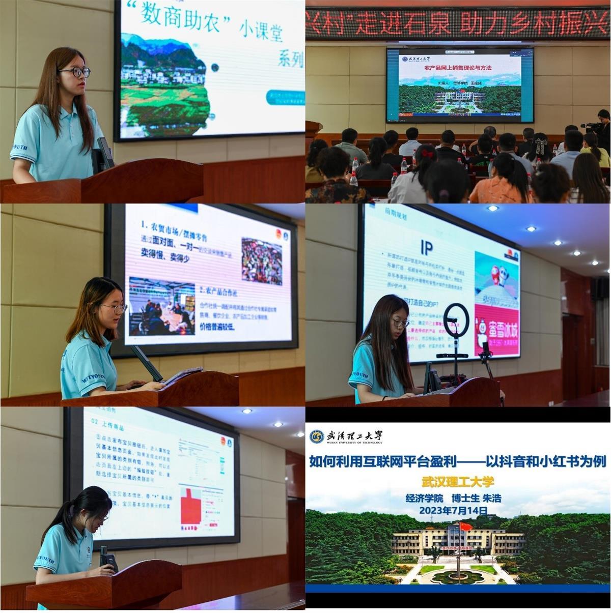 在第一讲《走进农村电商:农产品网上销售理论与方法》中,实践队队员陈思瑶引入课程导论,从多维度剖析“数商兴农”战略及其重要意义。武汉理工大学经济学院电子商务系王建成老师在此基础上进一步拓宽基本理论,介绍了五大电商营销理论并针对石泉县电商平台运营情况提出发展建议;在第二讲《掌握电商软件:网络销售平台的注册及使用》中,实践队队员王晓艺和牟函琳以实际案例对比电商网络销售与传统销售的区别,介绍利用四大电商平台推广当地农副产品的优势与特色,并详细说明各平台的注册及使用步骤;在第三讲《解读电商密码:如何利用互联网平台带货—以抖音和小红书为例》中,抖音百万获赞“网红”、武汉理工大学经济学院博士生朱浩通过展示个人账号运营情况,逐一解答账号如何定位、如何吸引流量以及流量如何变现等大家关切的问题;在第四讲《玩转电商直播:抖音直播带货实操及技巧》中,实践队队员苏婧瑜从前期规划、作品发布和直播带货三部分现场示范如何运营一个抖音账号。实践环节中,在实践队队员蔡小寒的鼓励下,现场诸多企业家和电商爱好者纷纷携带自家销售的农副产品亲身参与直播带货的体验环节。实践队员们通过话术指导和肢体指导提高体验者的直播技巧,整场直播共收获400余位观众观看和10000余个点赞,将讲座的互动氛围推向高潮。