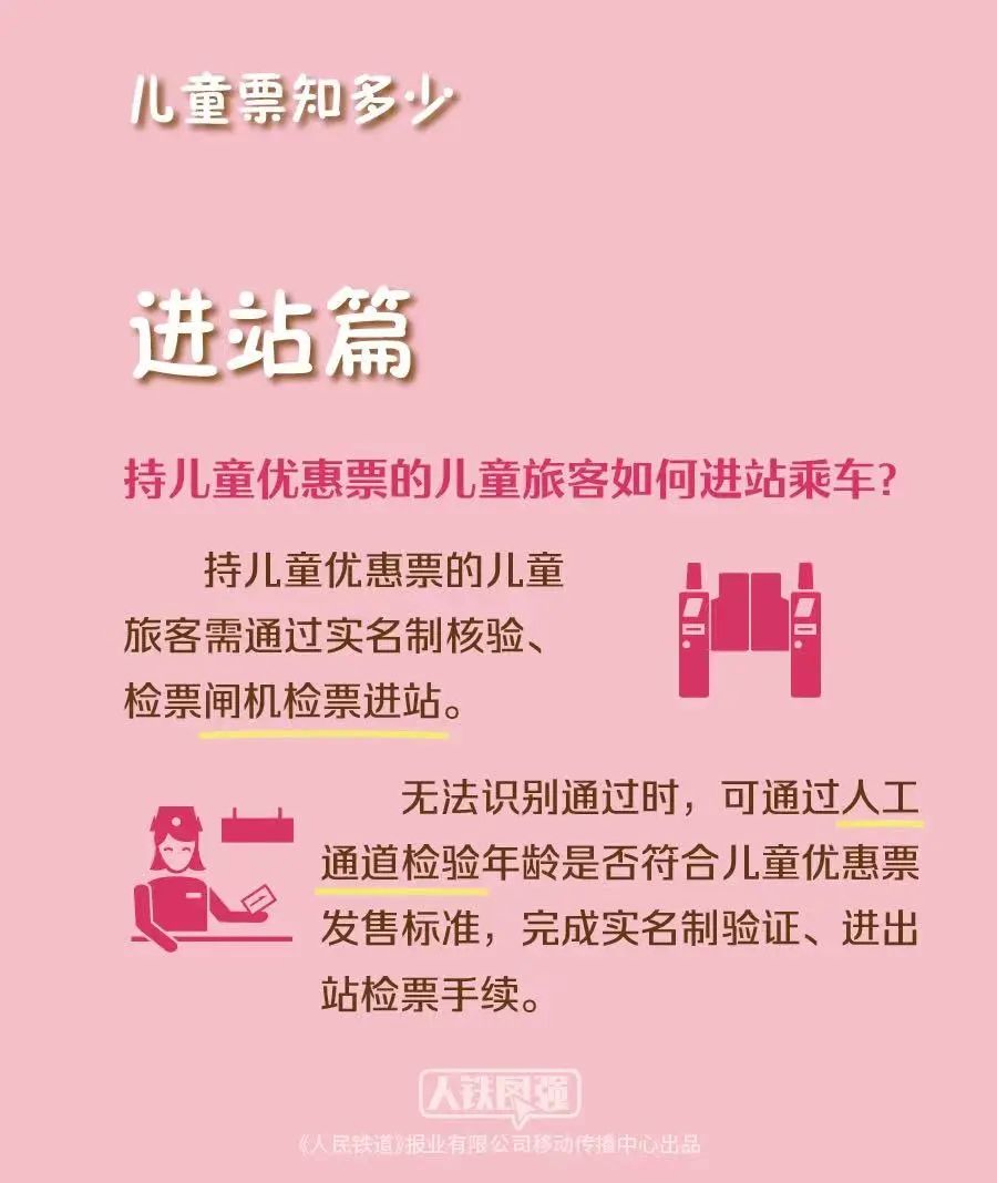 根据今年1月1日新版《铁路旅客运输规程》,随同成年人乘车的儿童,年满6周岁且未满14周岁的应当购买儿童优惠票,儿童优惠票须使用儿童本人的身份信息购买。相应的,持儿童优惠票的儿童旅客进站时应出示本人的身份证明,通过实名制核验、检票闸机检票进站。
