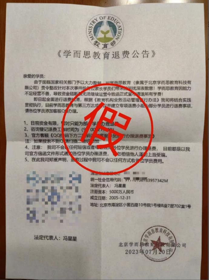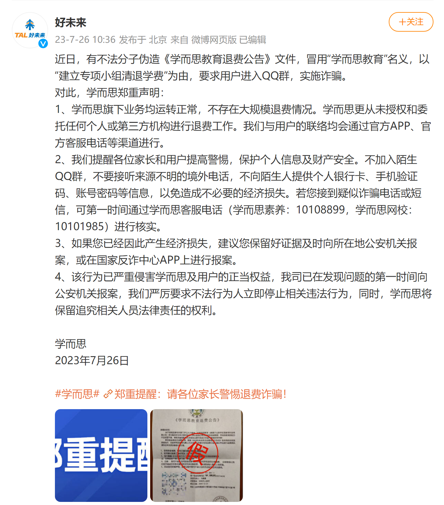 近日,有不法分子伪造《学而思教育退费公告》文件,冒用“学而思教育”名义,以“建立专项小组清退学费”为由,要求用户进入QQ群,实施诈骗。