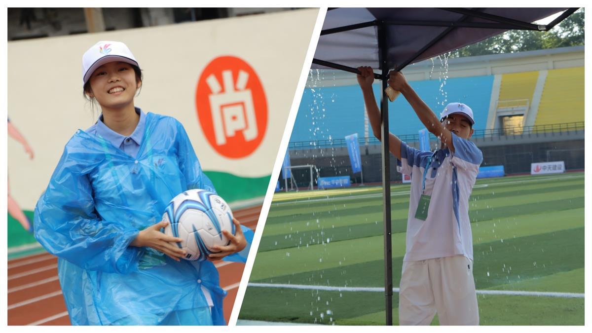 “嘟——”哨声响起,球出界了,志愿者迅速跑过去为球员们捡球。在省中运会初中组足球比赛期间,赛场上的运动员奋勇拼搏,场下的志愿者们同样奔波忙碌,边界球、球门球、角球、任意球……他们奔过去捡球,默默地守护赛场秩序。而遇到比赛日下雨,学校志愿者们提前到达赛场,撑起帐篷、清理积水,他们分工明确,在各自的岗位上尽职尽责。