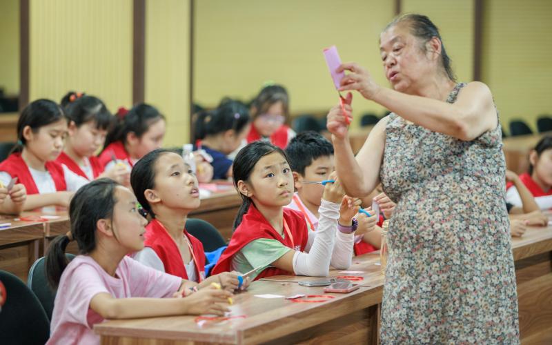 顾小玲为孩子们详细讲解剪纸技巧。新京报记者王子诚摄