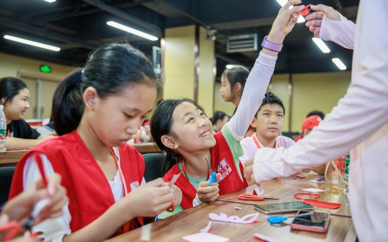 “你什么时候爱上剪纸的?”“你最喜欢的剪纸作品是什么?”在采访环节,小记者们围绕顾小玲的经历接连发问。顾小玲告诉同学们,她生在北京、长在新疆,13岁时便跟着母亲学习剪纸,生得一双巧手,就日益喜欢上了这个“手艺活儿”。后来,刺绣、中国结、布艺、珠编、衍花……她尝试钻研不同的领域。