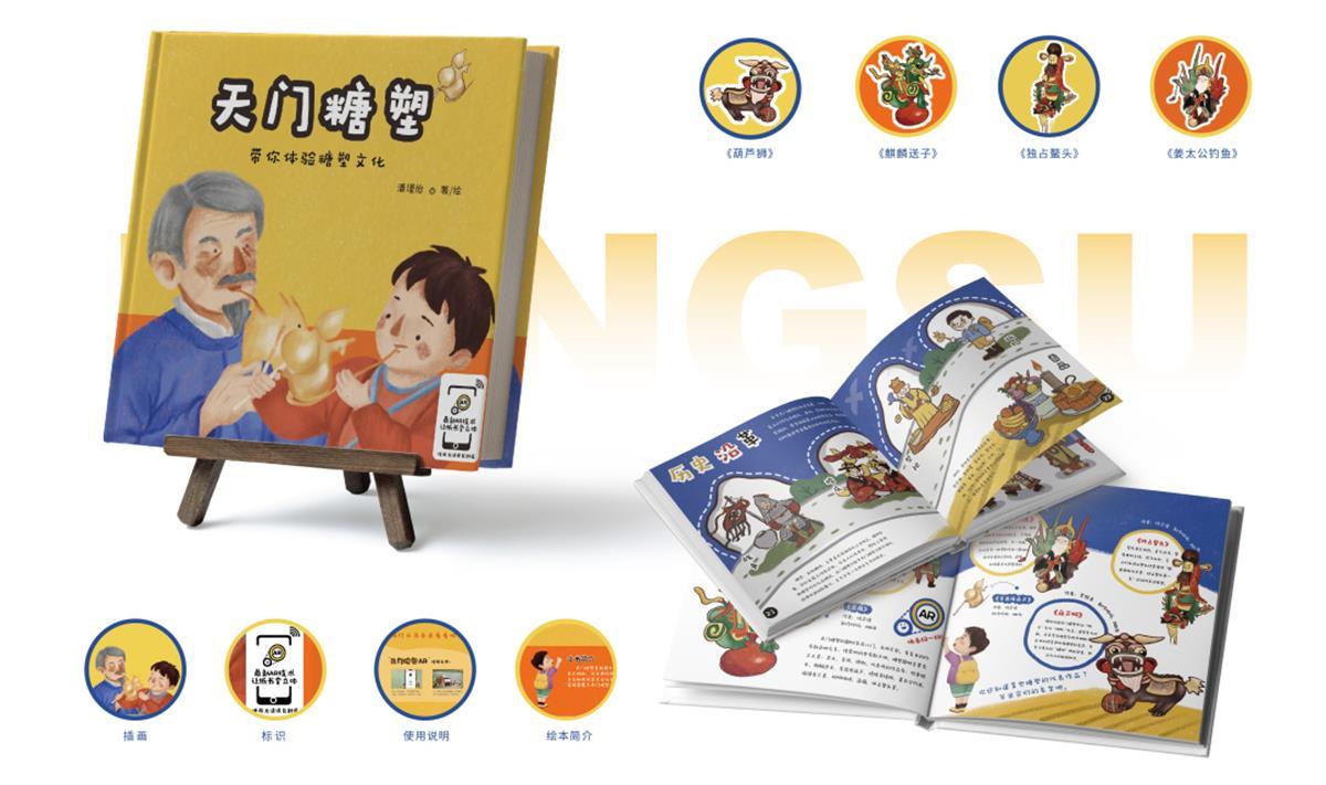 《天门糖塑》AR绘本由该校艺术设计学院的5名学生,历时3个月创作而成。绘本在参考天门群艺馆馆长王子丹所著的《天门糖塑》一书的基础上,整合了天门糖塑的相关资料,以国家级非物质文化遗产代表性项目传承人罗照英为人物原型,对其进行特征分析与角色转化,形象生动地展示了天门糖塑文化。绘本不仅采用立体化设计,还借助AR数字技术,通过视、听、触觉的设计丰富读者的阅读体验,使其产生情感共鸣。