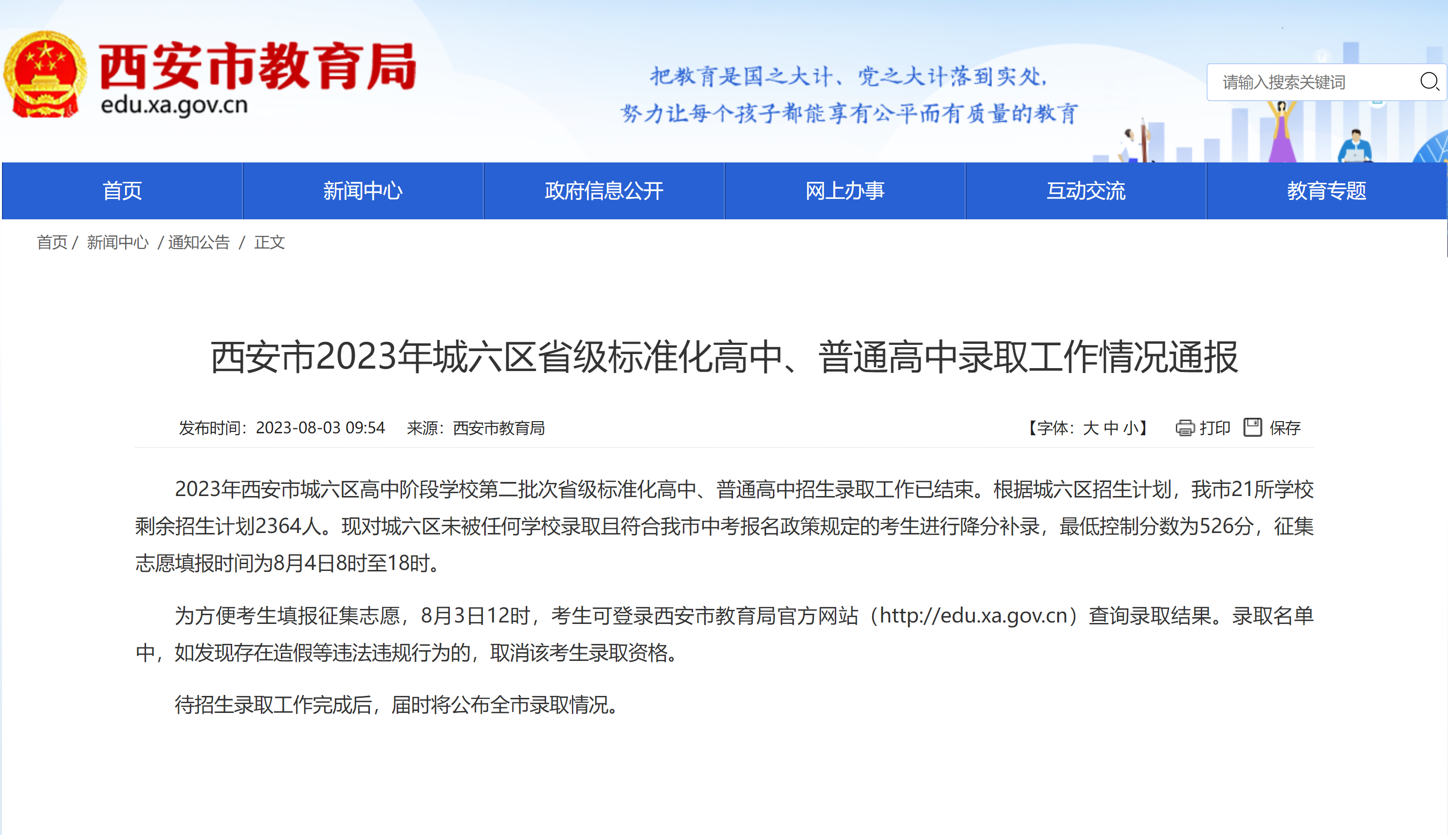 2023年西安市城六区高中阶段学校第二批次省级标准化高中、普通高中招生录取工作已结束。根据城六区招生计划,我市21所学校剩余招生计划2364人。现对城六区未被任何学校录取且符合我市中考报名政策规定的考生进行降分补录,最低控制分数为526分,征集志愿填报时间为8月4日8时至18时。