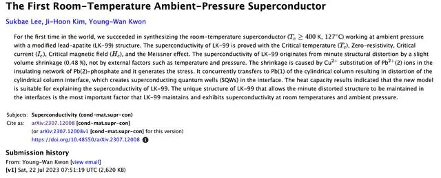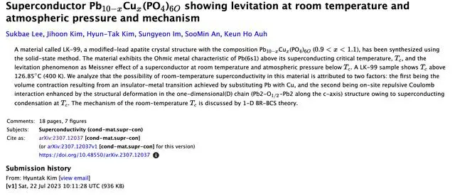 7月下旬,韩国研究团队在预印本网站arXiv平台上提交了两篇论文,声称发现了世界上首个室温常压超导体材料——LK-99(改性铅磷灰石晶体结构)。